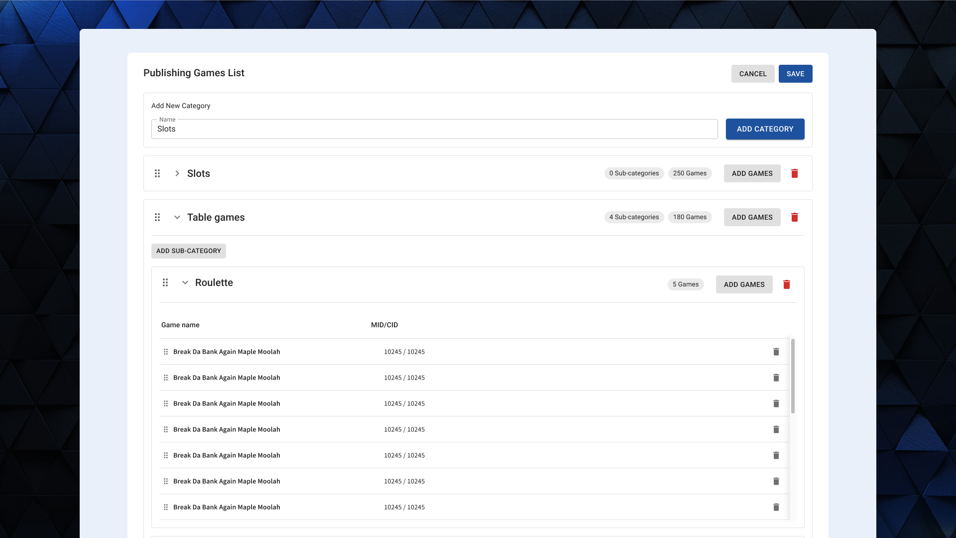 Designed and developed a comprehensive back office management system that empowers casino operators to configure, manage, and deploy casino lobbies across multiple markets and brands. This enterprise-grade platform streamlines complex workflows including game library management, promotion creation, bet configuration, and multi-market deployments.