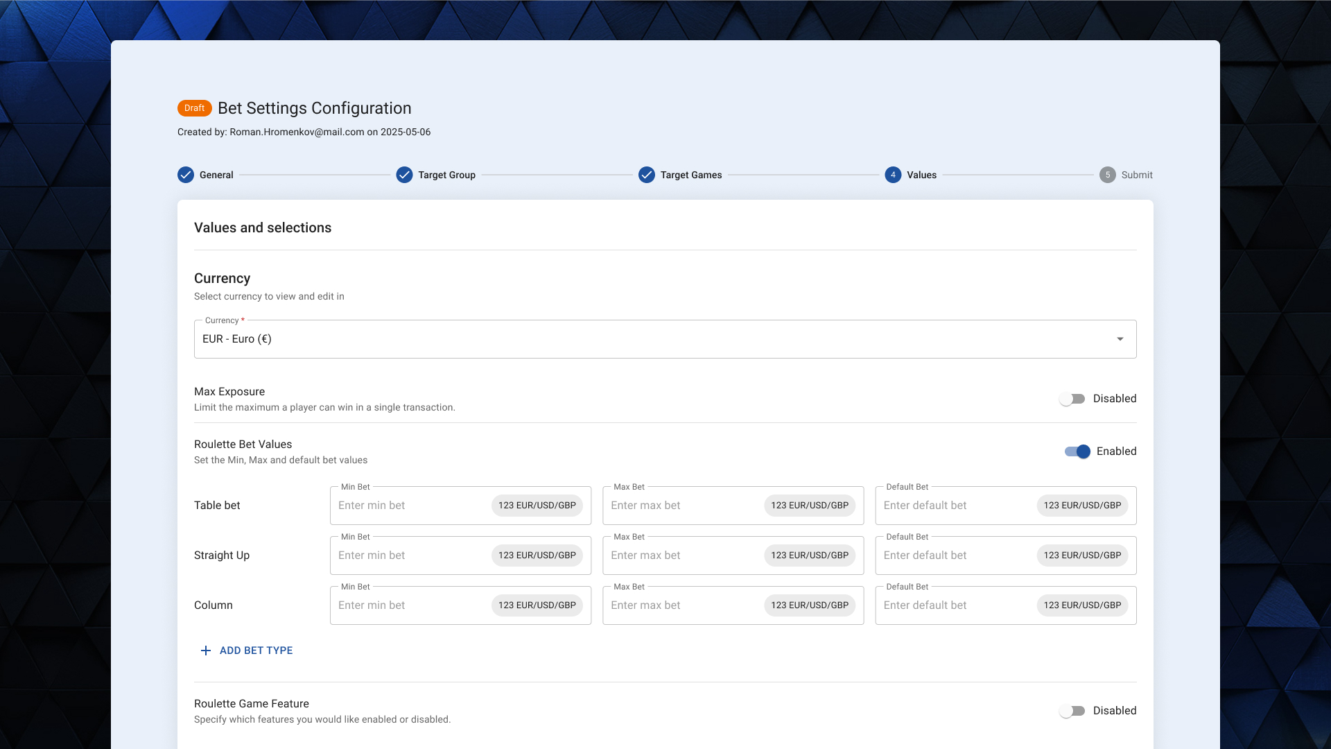 • Roulette bet value configuration (Min, Max, Default) for multiple bet types: