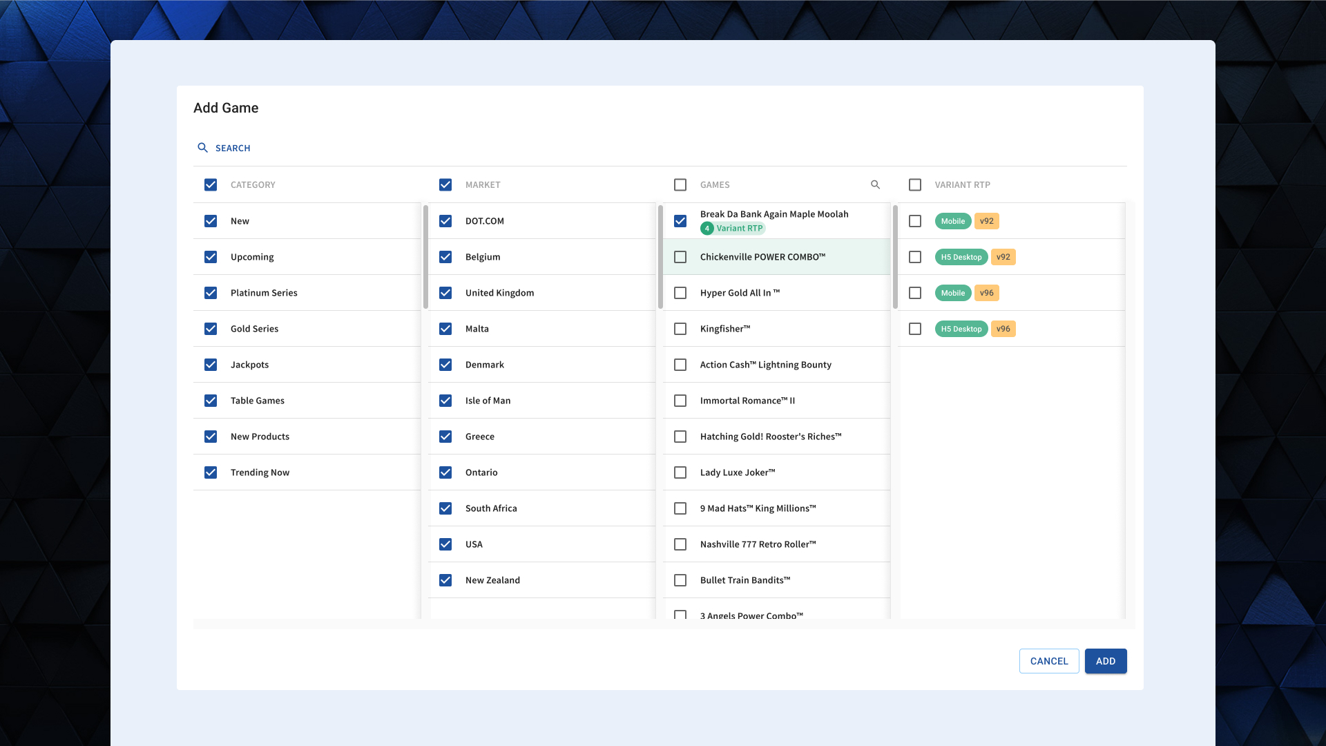 • Advanced game selector with multi-dimensional filtering (Category, Market, Games, Variant RTP)