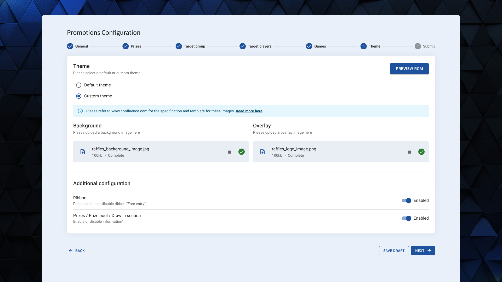 • Comprehensive multi-step workflow (General → Prizes → Target Group → Target Players → Games → Theme → Submit)